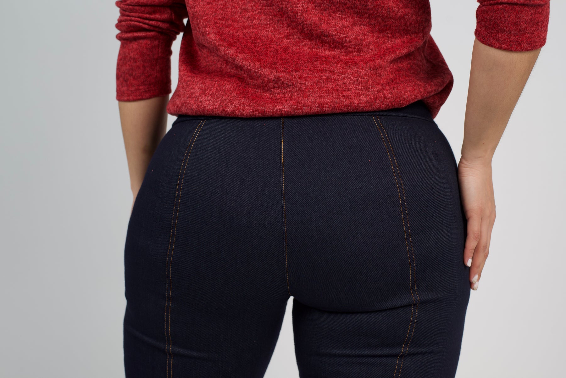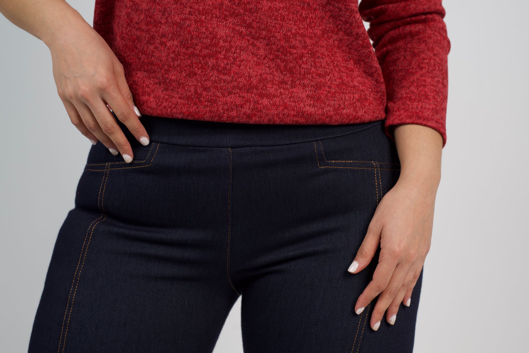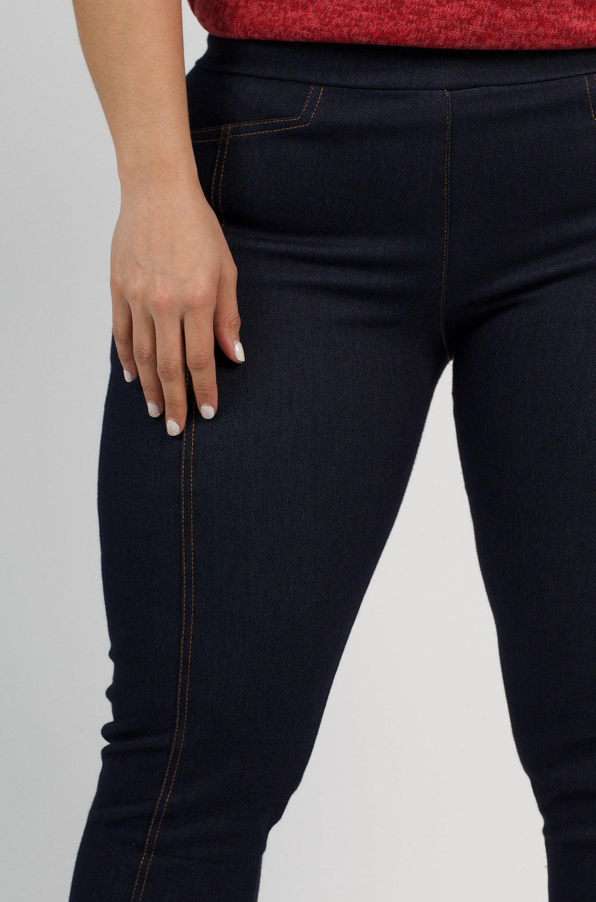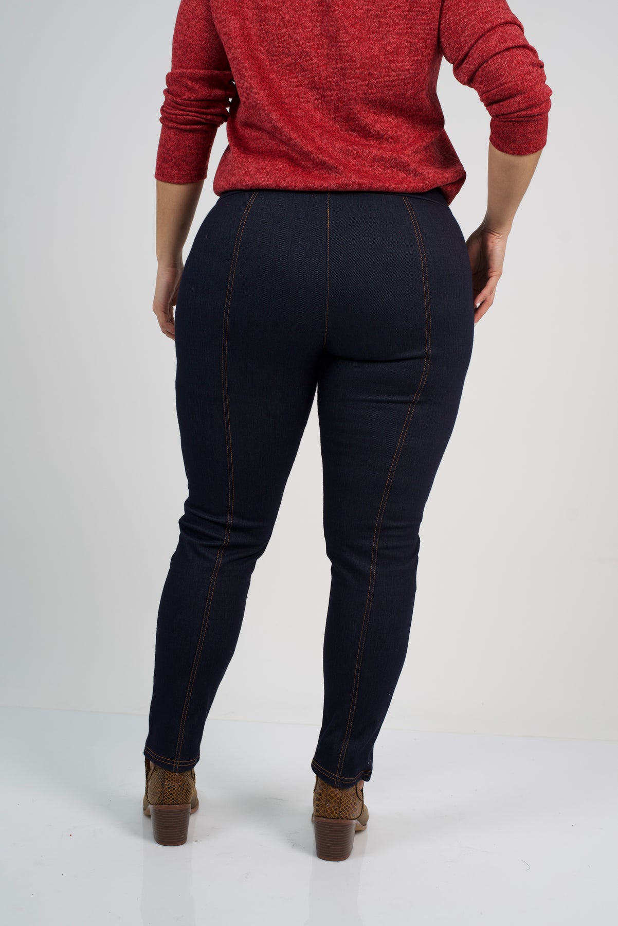 Características: Calza básica de mezclilla, pretina elastizada con diseño de costuras en sus piernas.