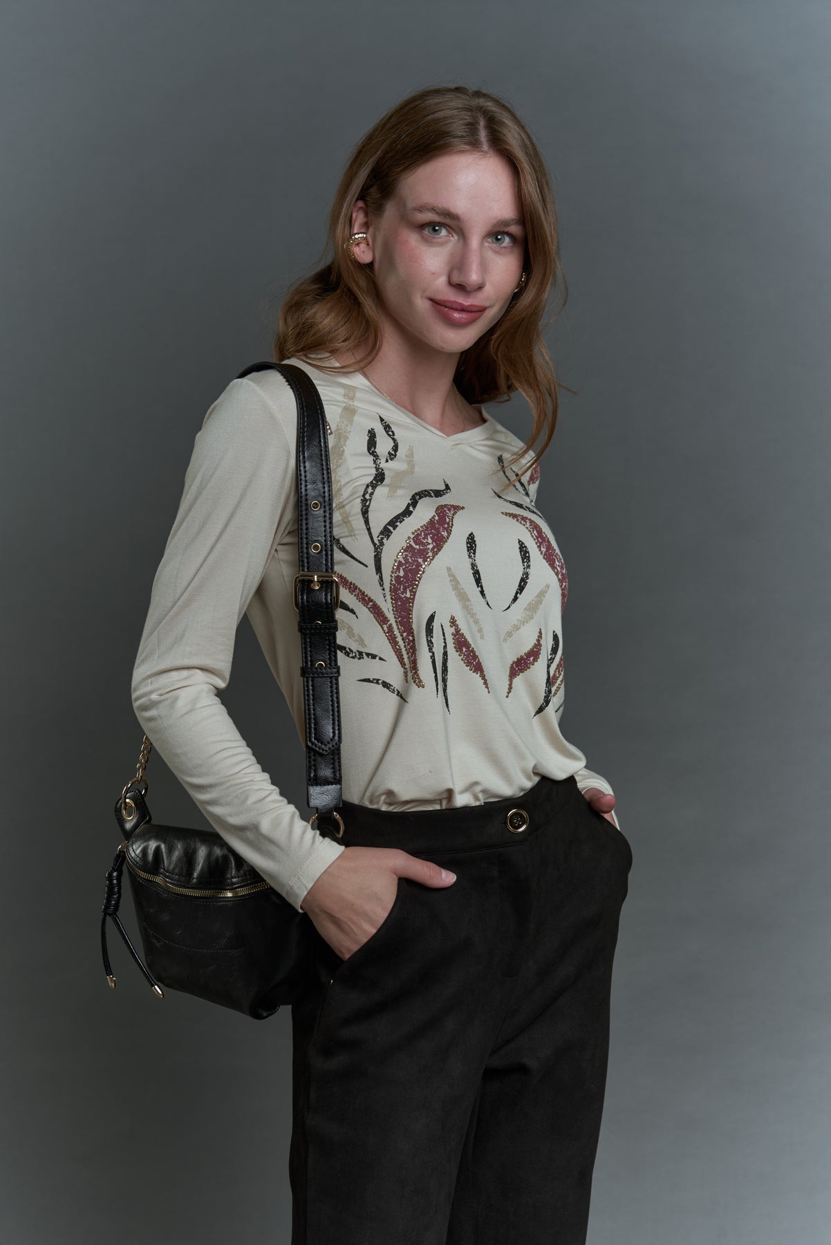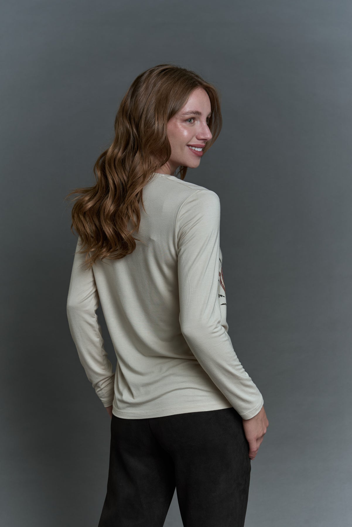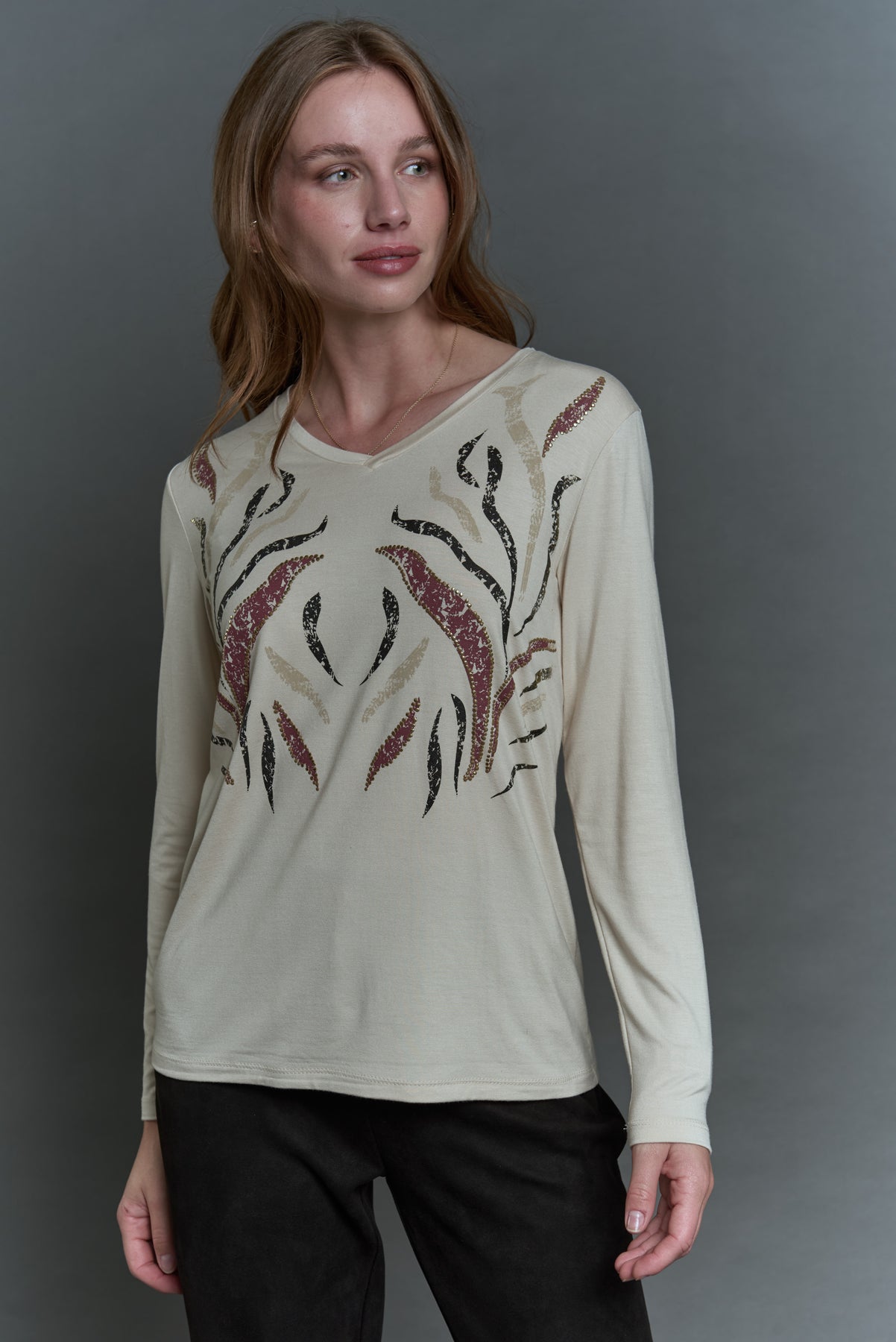 Características: Polera de manga larga en tono crudo con delicado estampado frontal en tonos negro, terracota y detalles brillantes que aportan un toque sofisticado. Su escote redondo y tejido suave ofrecen comodidad y un calce favorecedor.