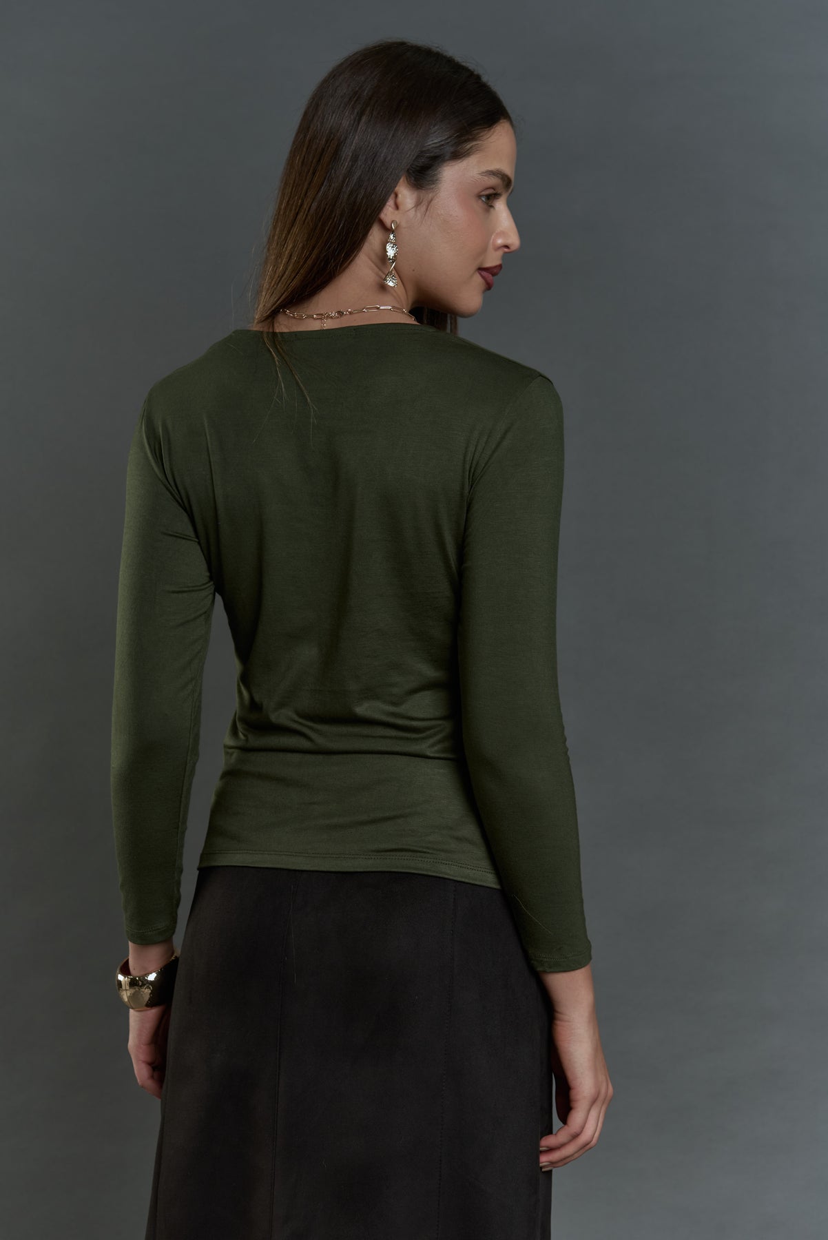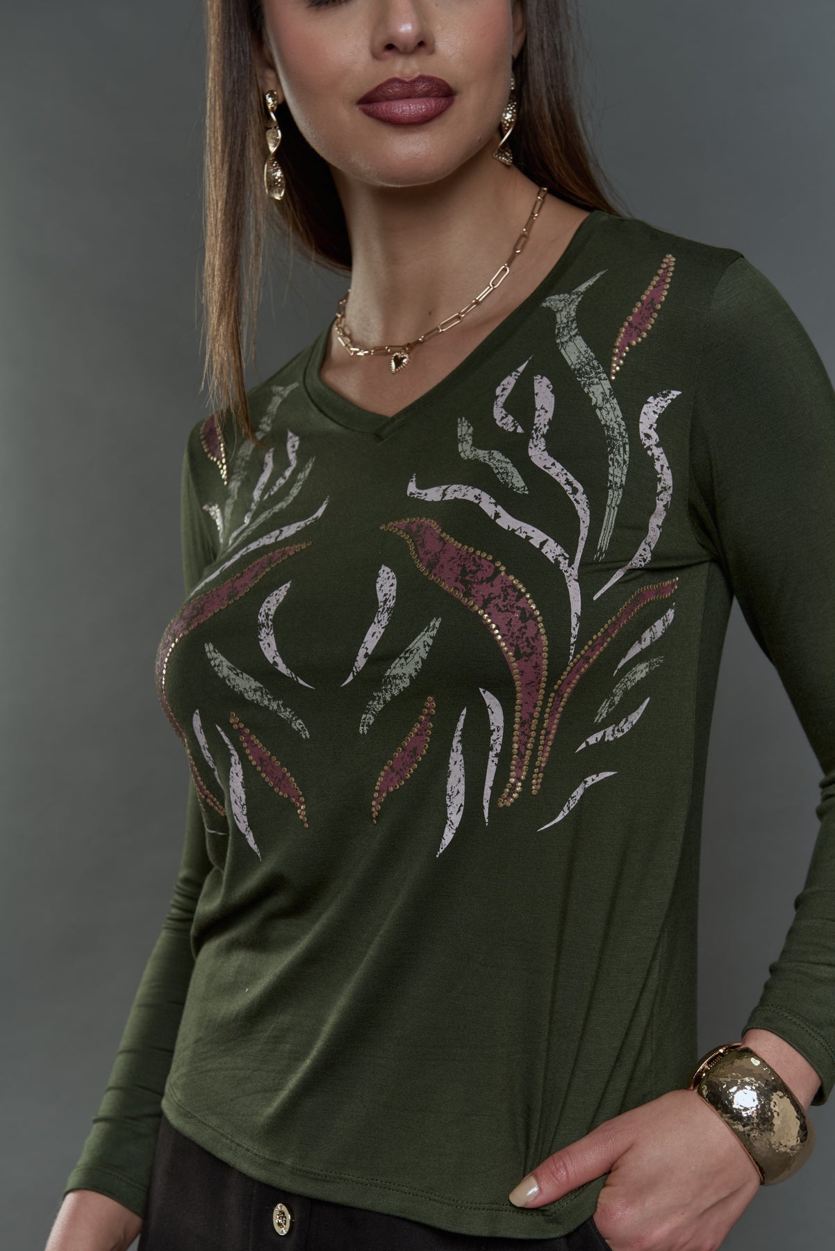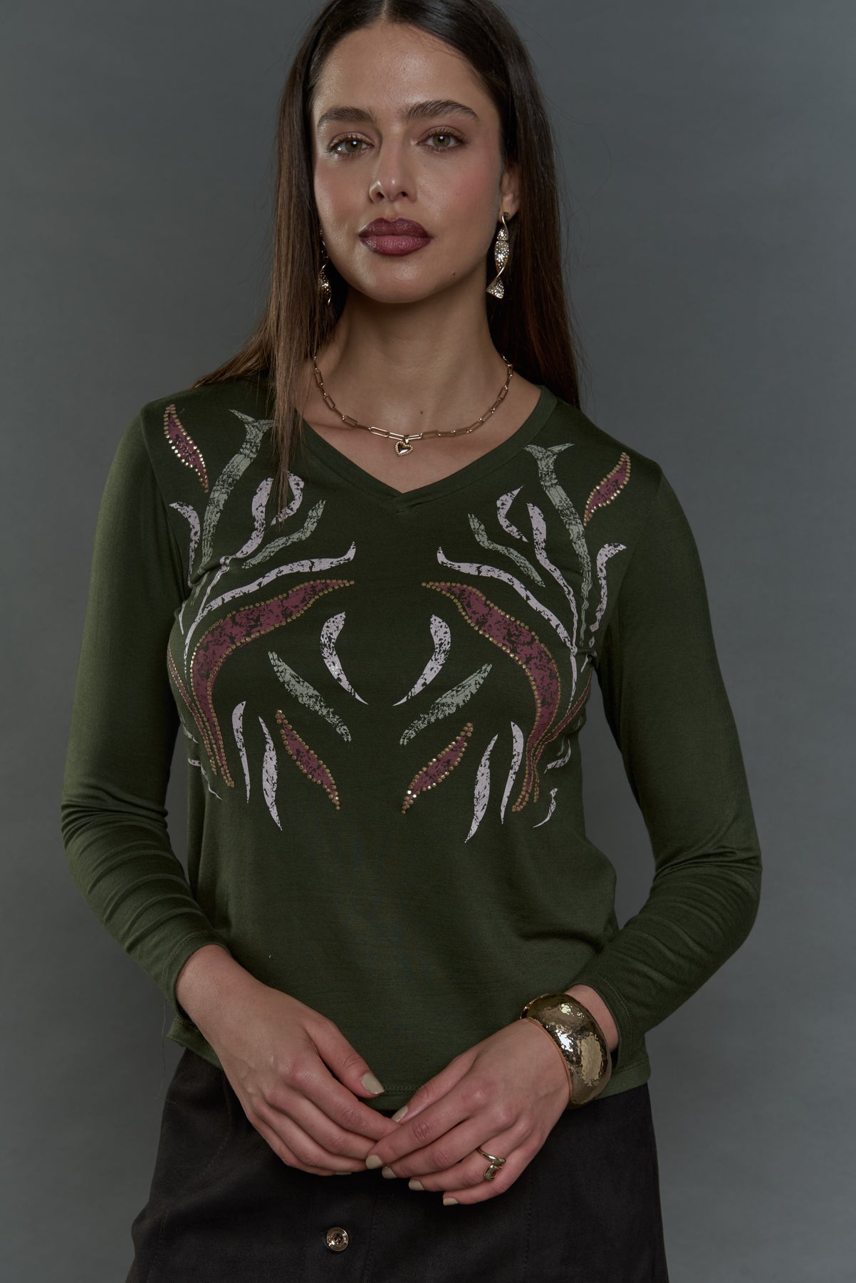 Características: Polera de manga larga en tono verde con delicado estampado frontal en tonos negro, terracota y detalles brillantes que aportan un toque sofisticado. Su escote redondo y tejido suave ofrecen comodidad y un calce favorecedor.