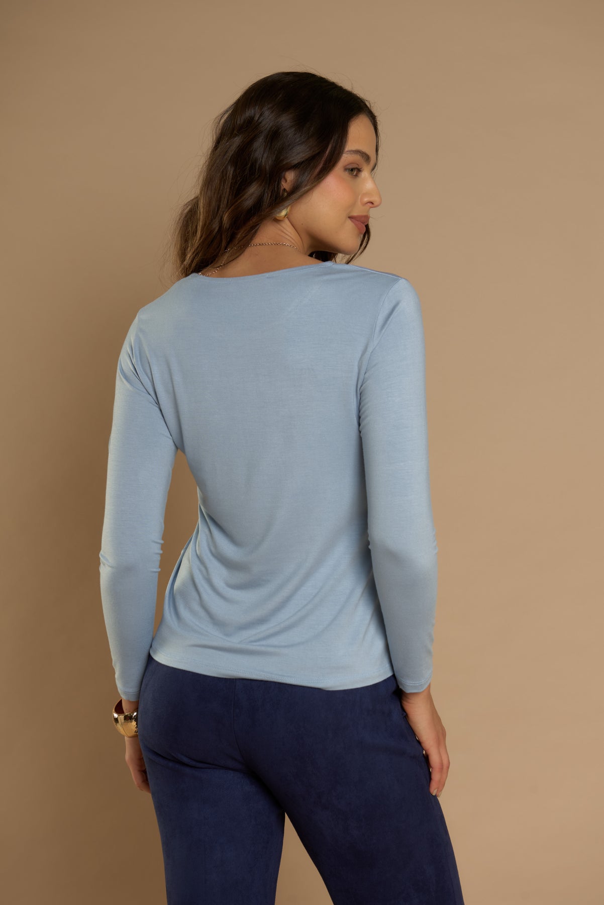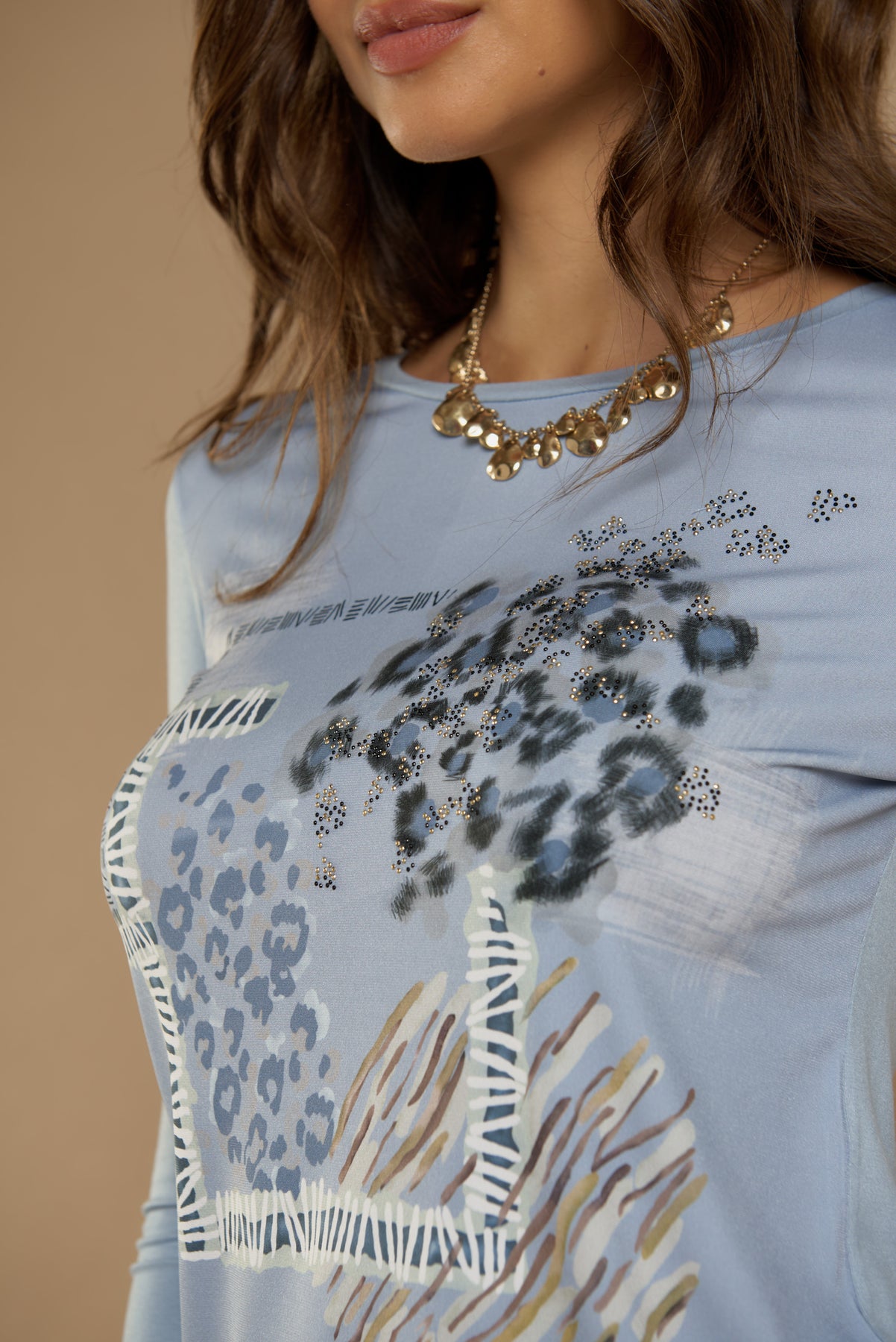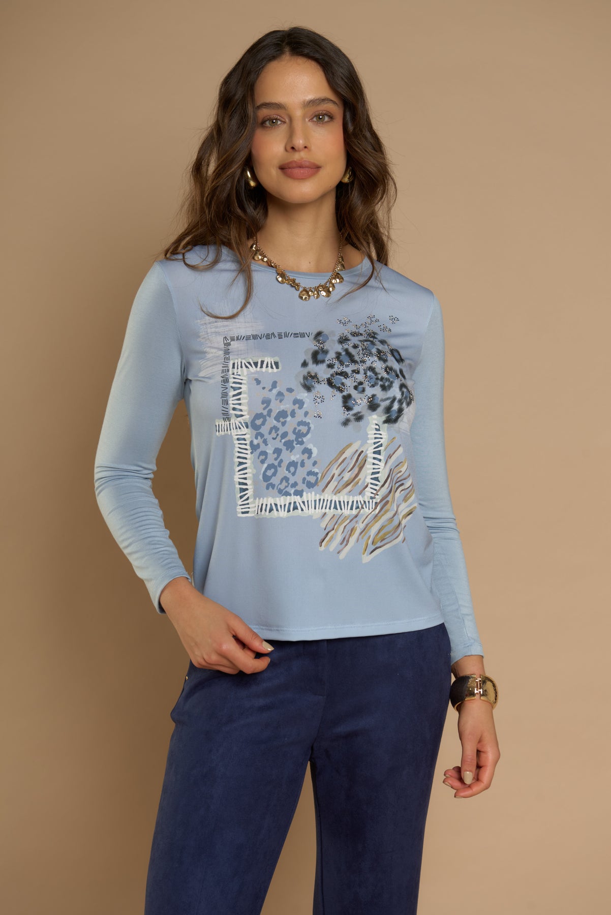Características: Polera de manga larga en tono celeste, confeccionada en tela suave y ligera que brinda comodidad durante todo el día. Su diseño destaca por un estampado artístico con detalles tipo animal print y aplicaciones brillantes que aportan un toque moderno y sofisticado.