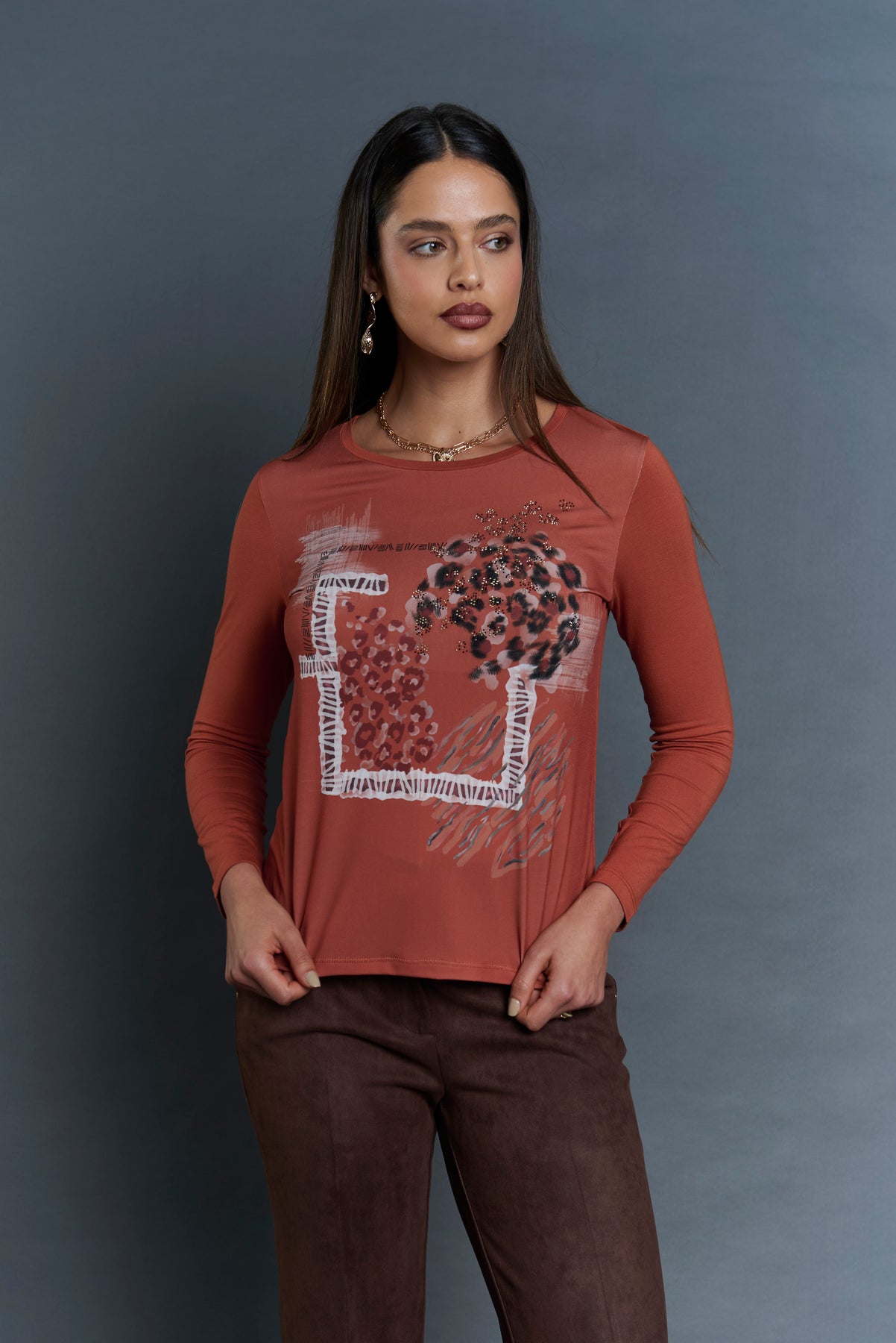 Características: Polera de manga larga en tono terracota, confeccionada en tela suave y ligera que brinda comodidad durante todo el día. Su diseño destaca por un estampado artístico con detalles tipo animal print y aplicaciones brillantes que aportan un toque moderno y sofisticado.