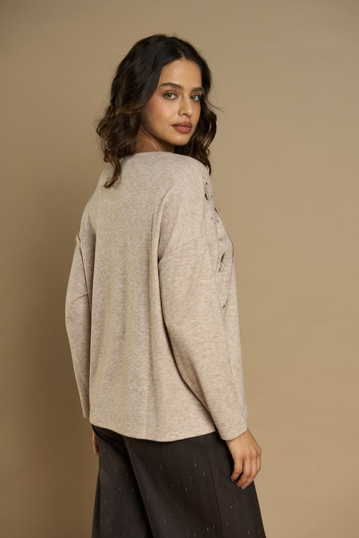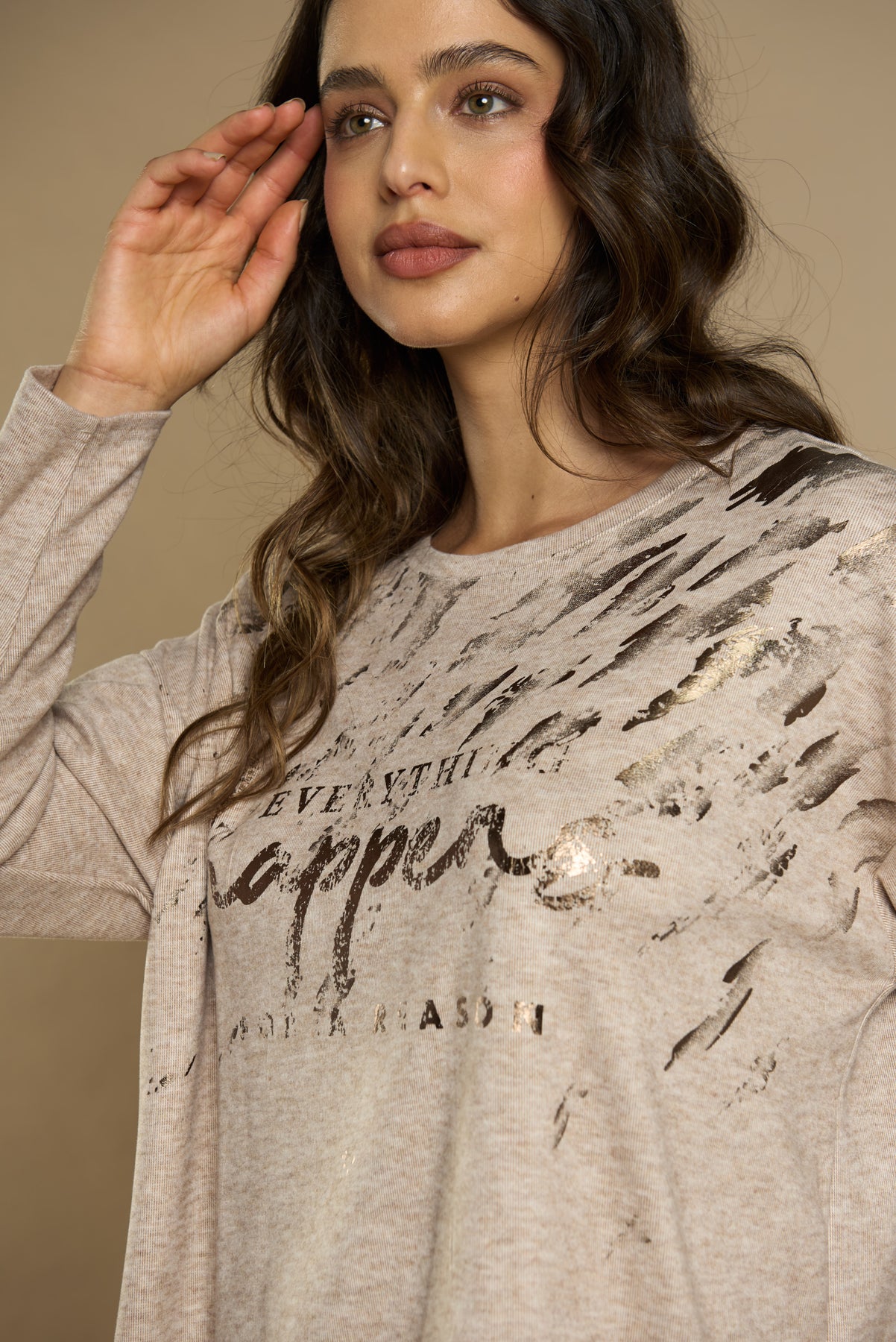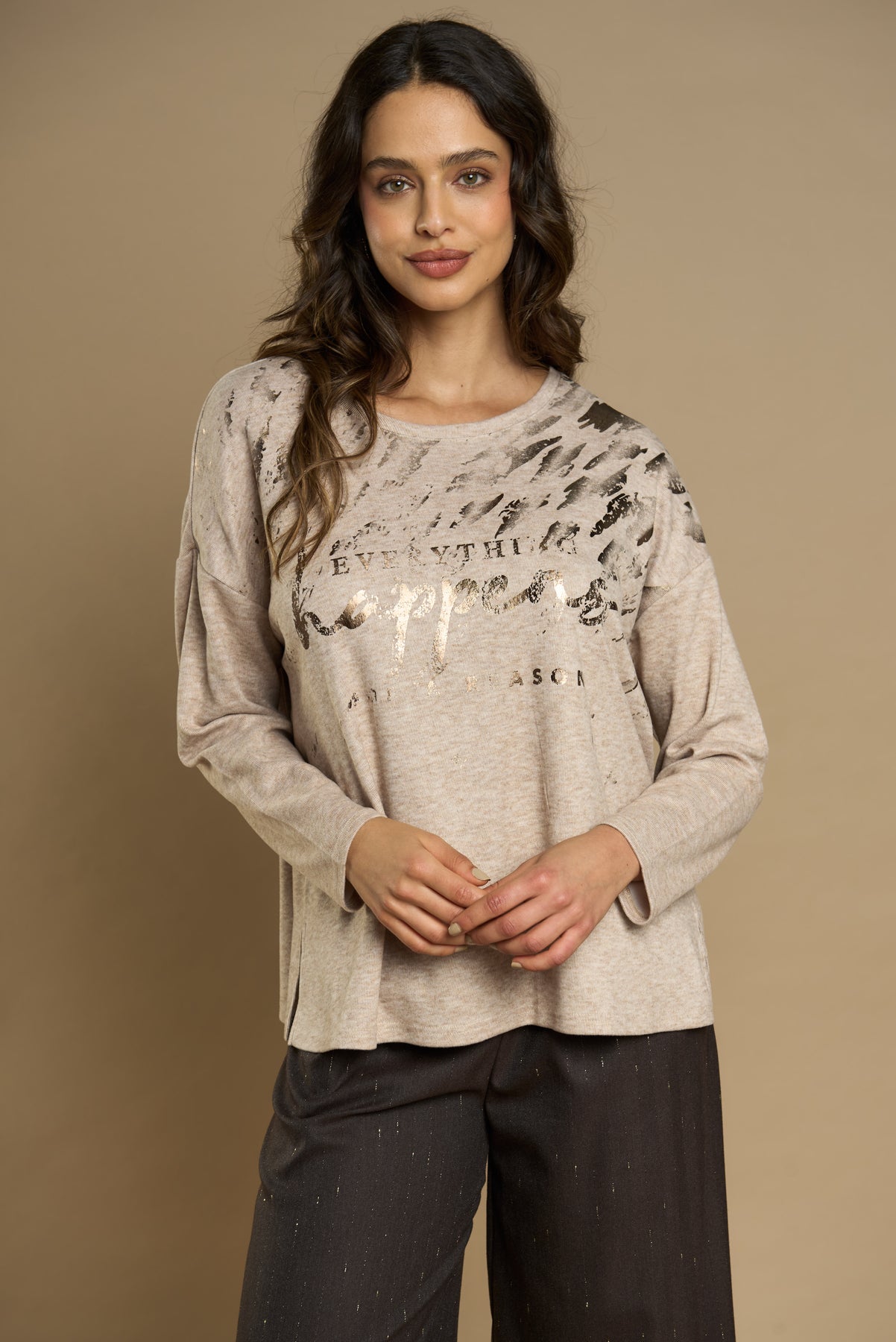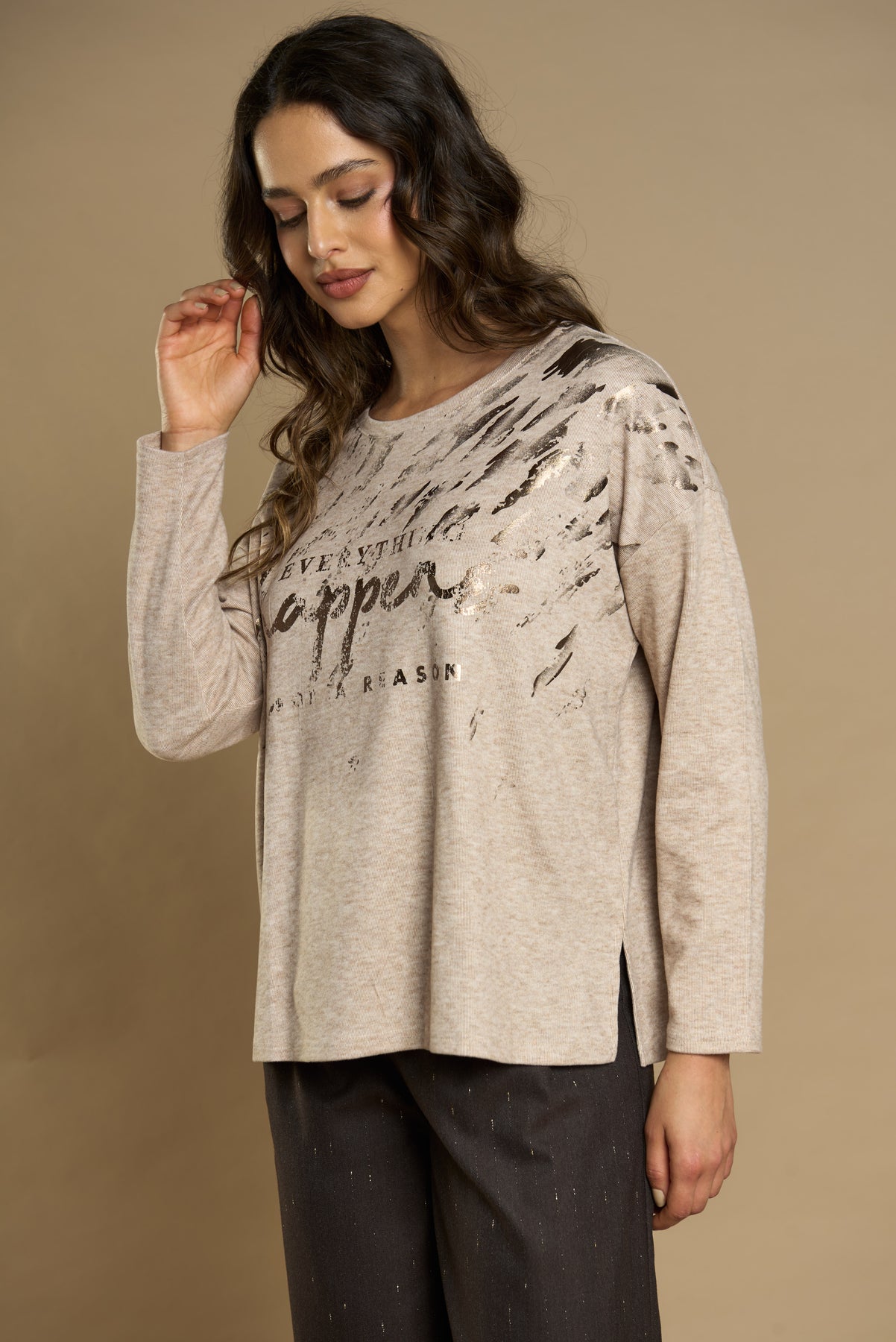 Características: Manga larga de la línea italiana, confeccionada en un suave tono beige con estampado artístico y detalles tipográficos en acabado metalizado.