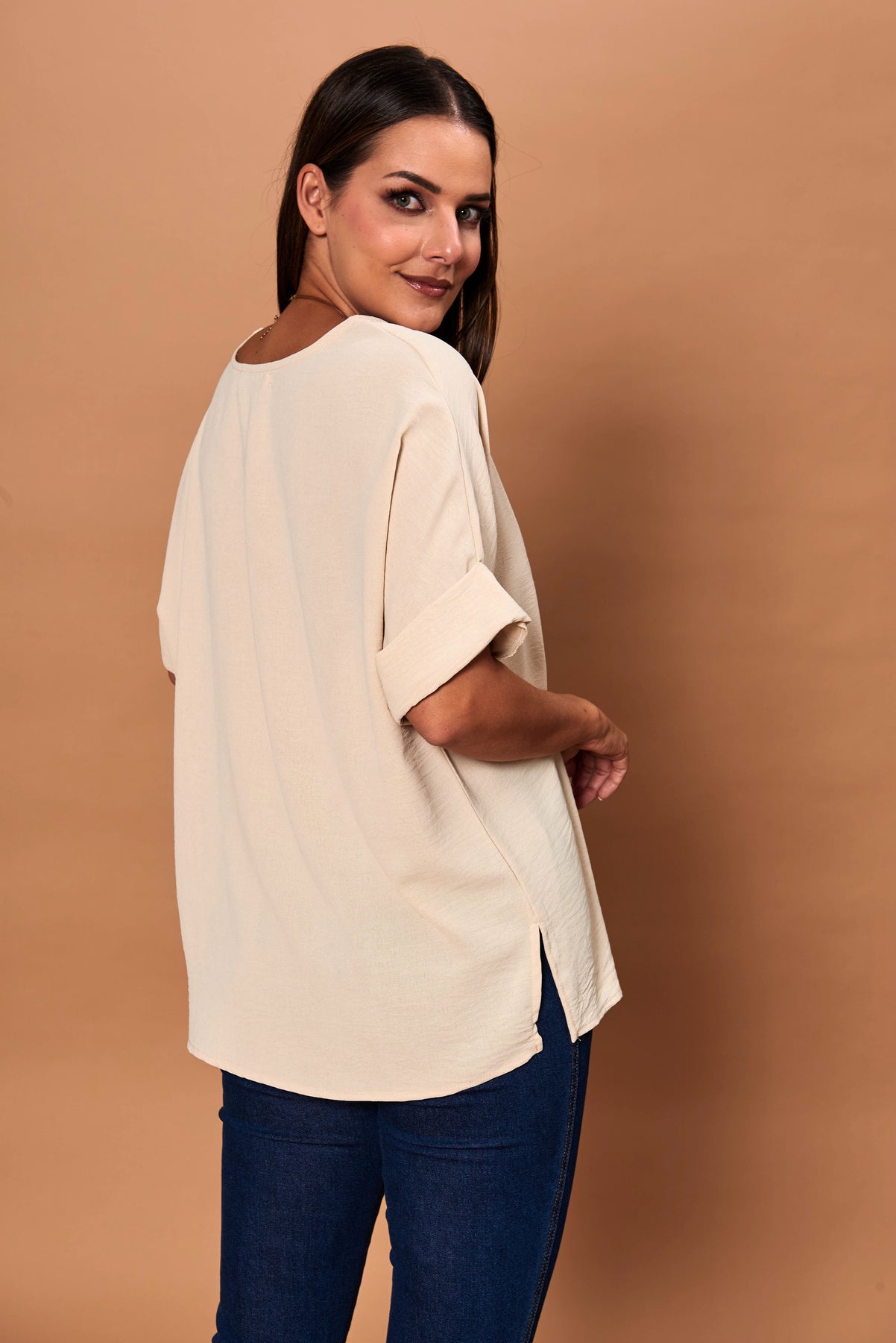 Características: Blusa manga corta, con escote de cuello redondo, estilo Italiano por lo que es Oversize. Tiene dobles en las mangas y pequeños tajali en los costados