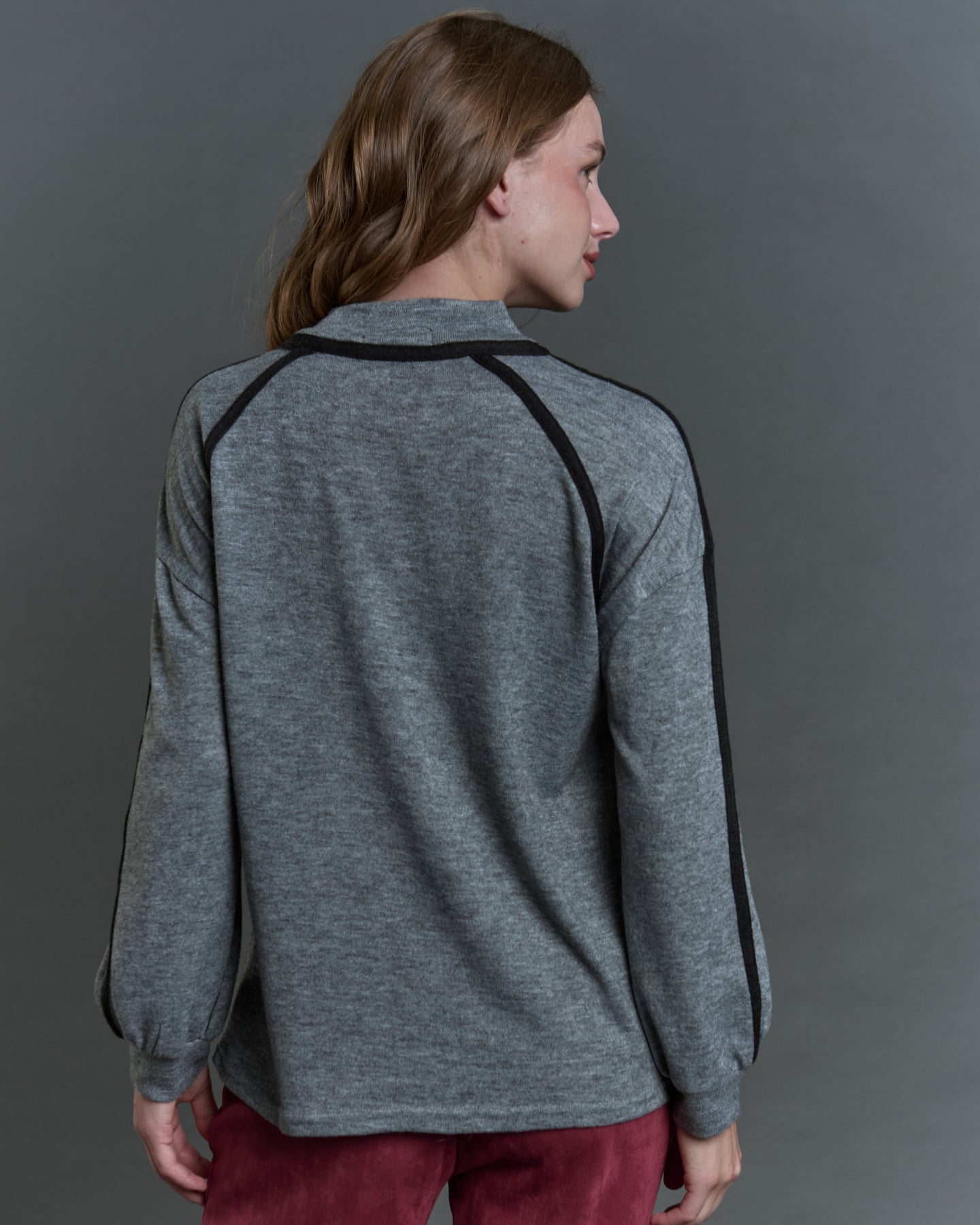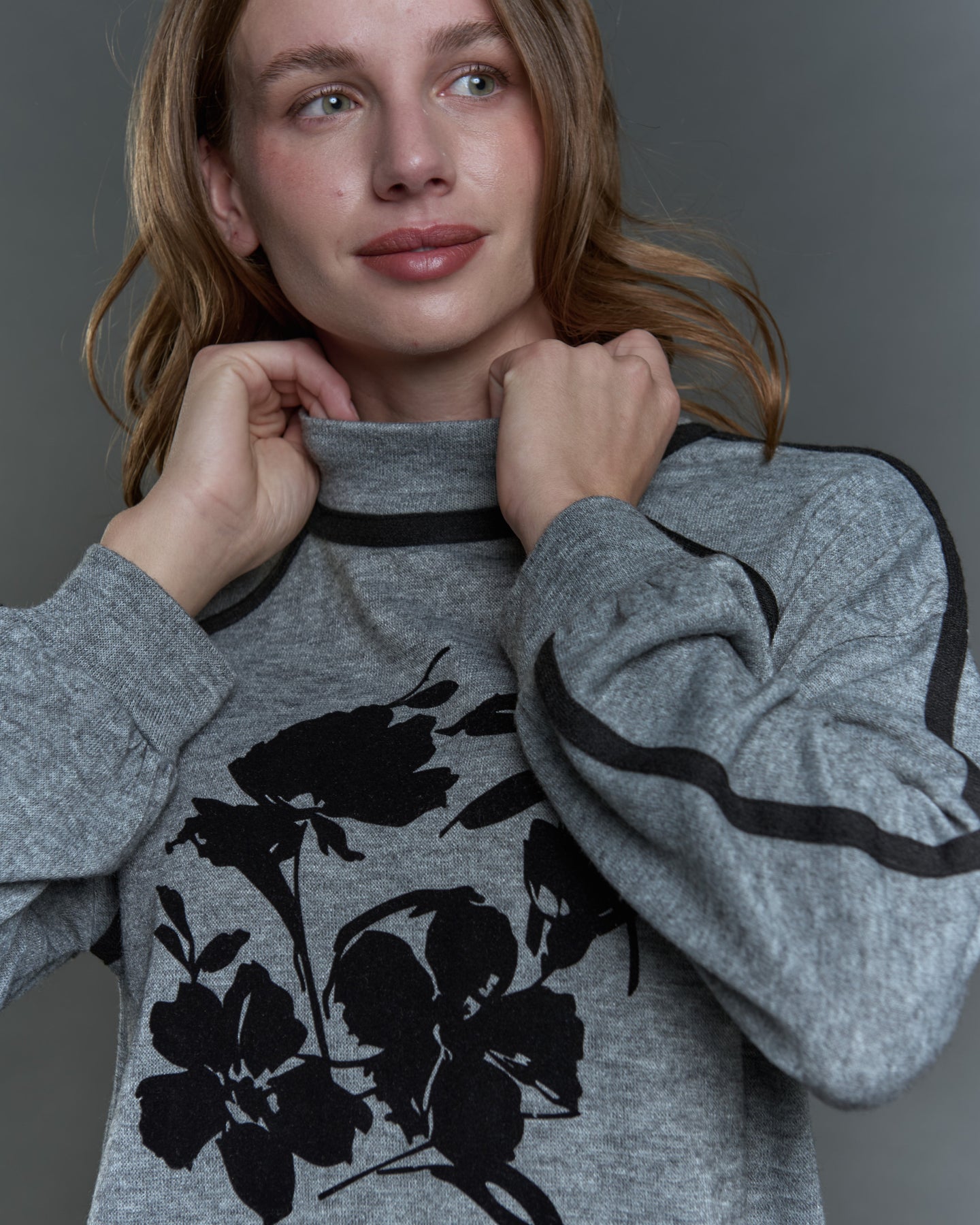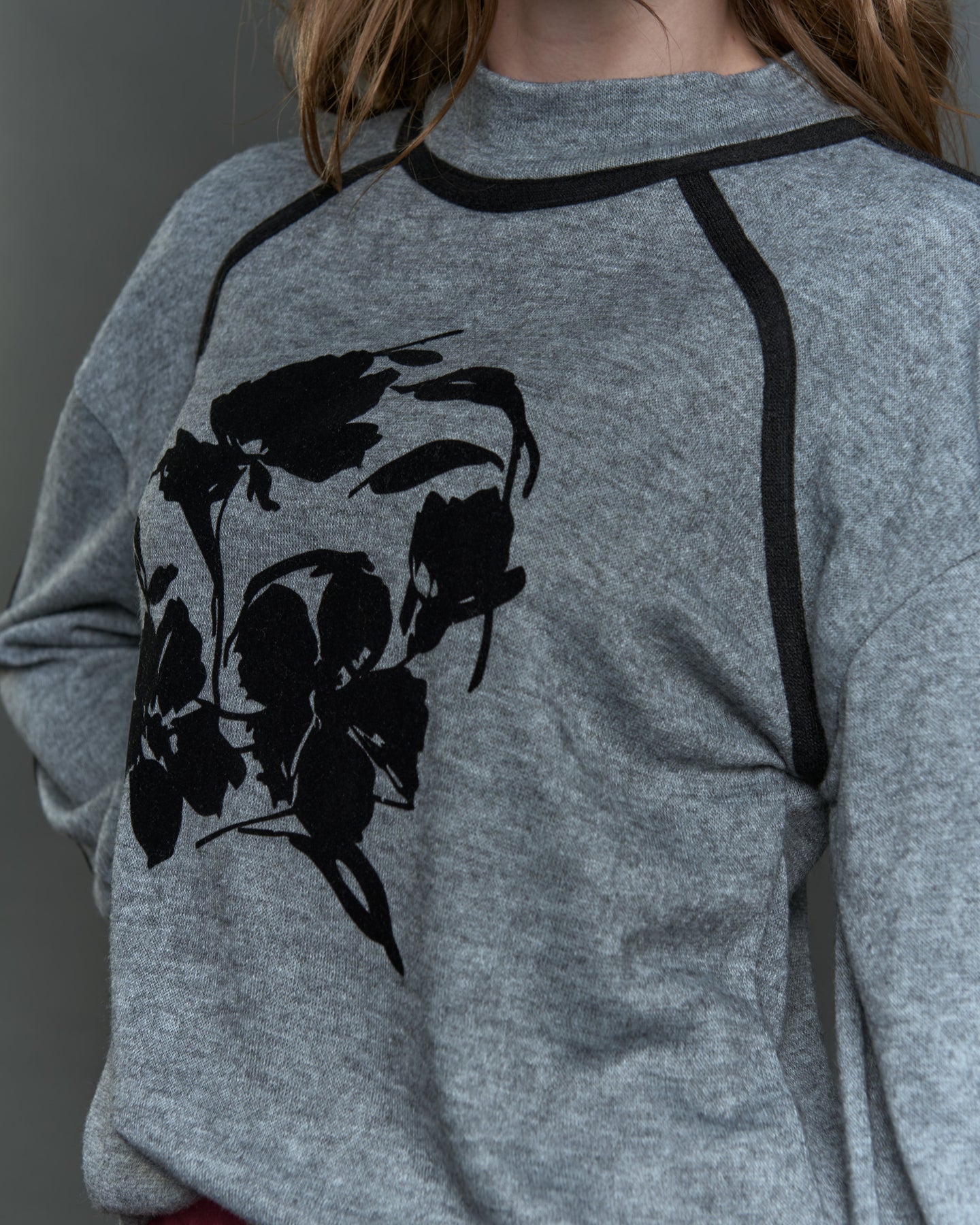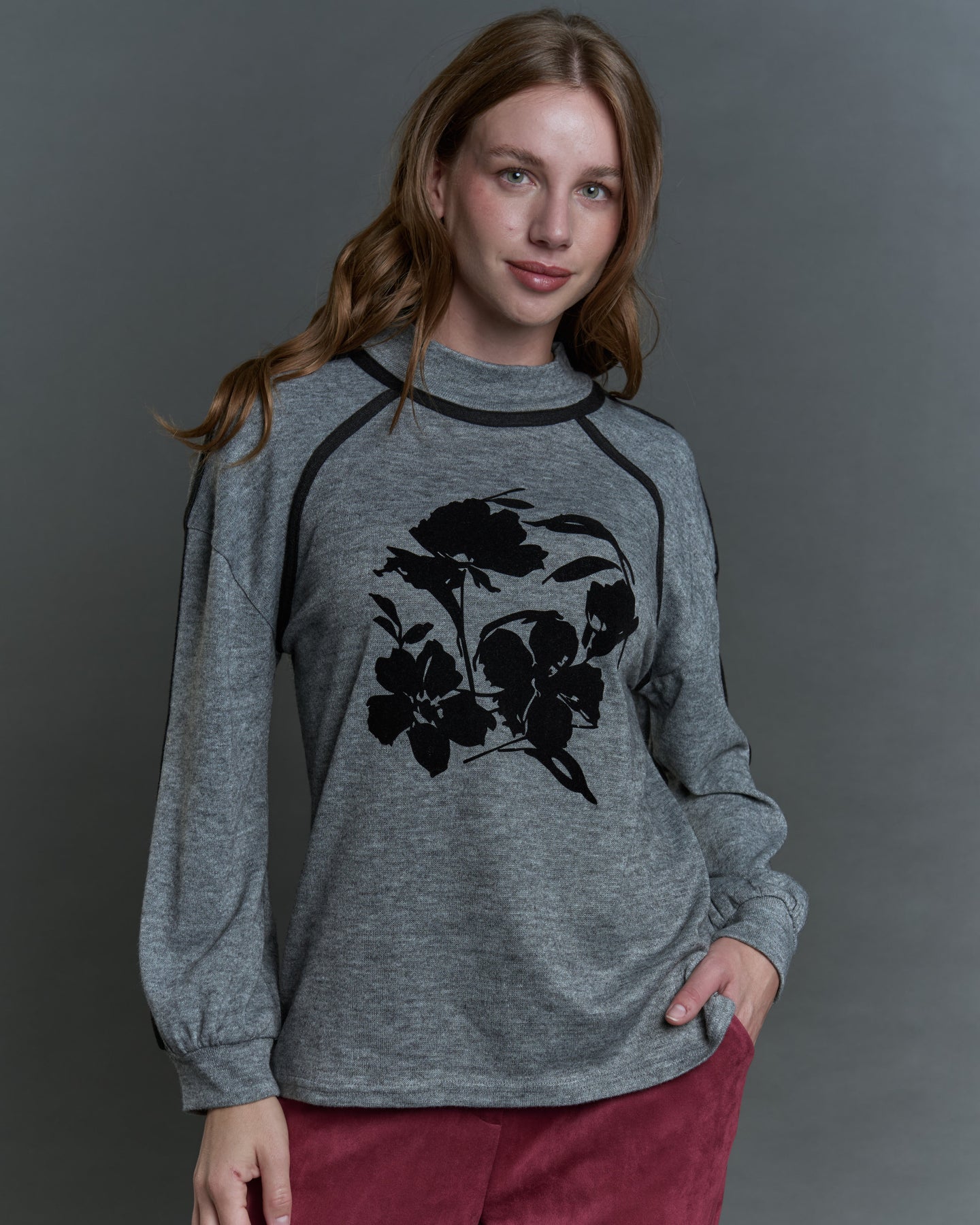 Características: Polera de manga larga en tono gris melange, con un diseño frontal de flores en contraste negro que aporta un estilo moderno y femenino. Confeccionada en un tejido suave y abrigador, ofrece comodidad durante todo el día.