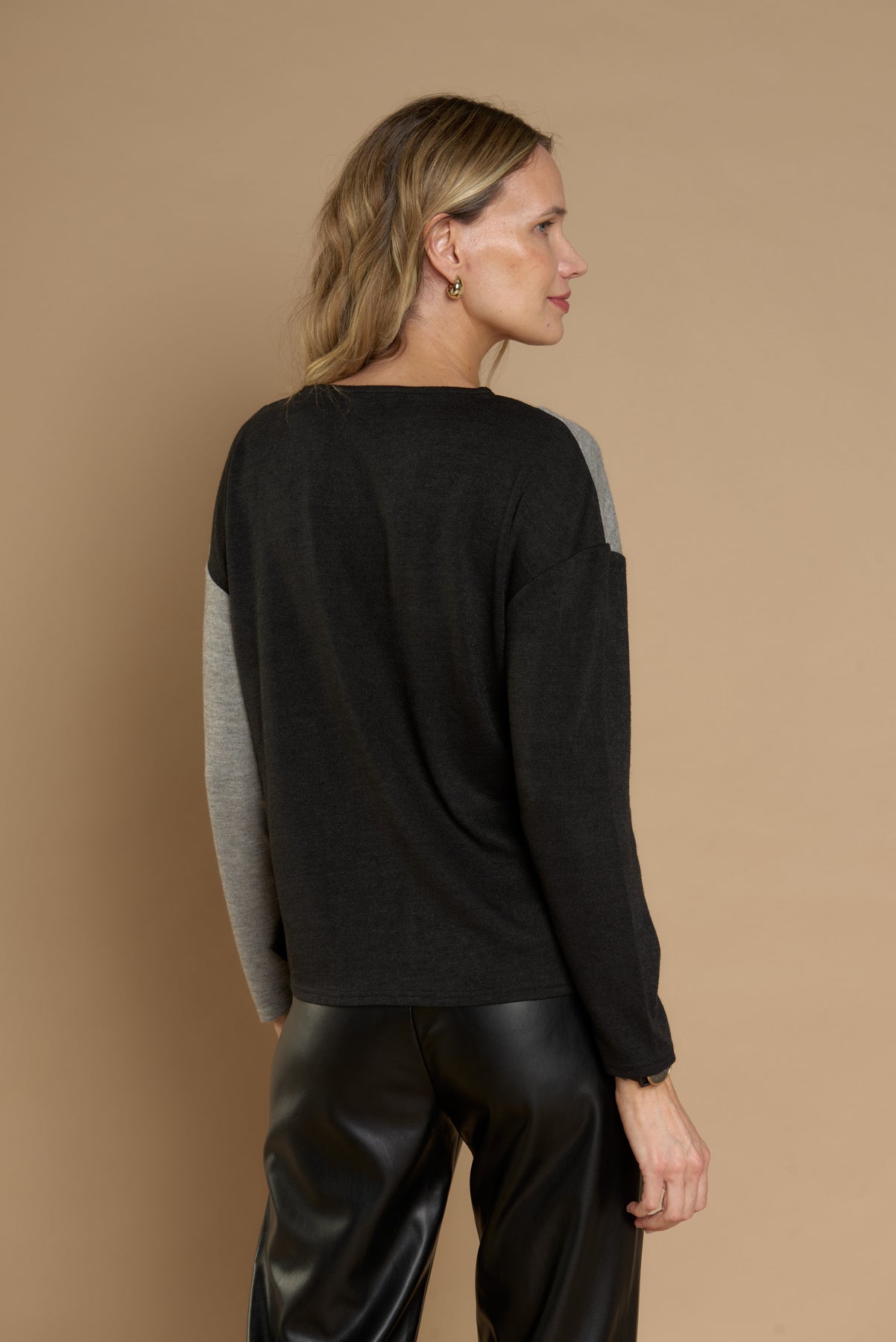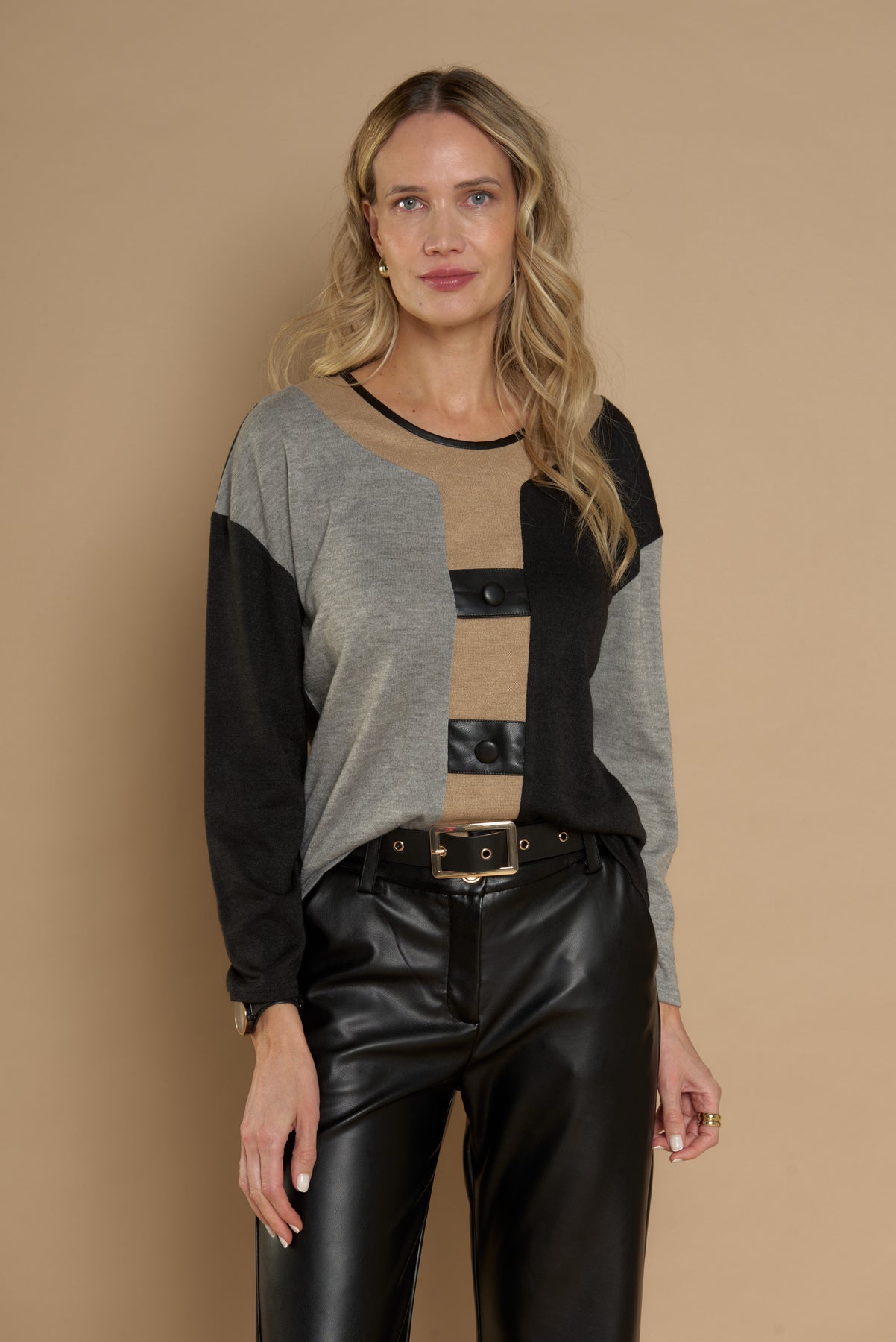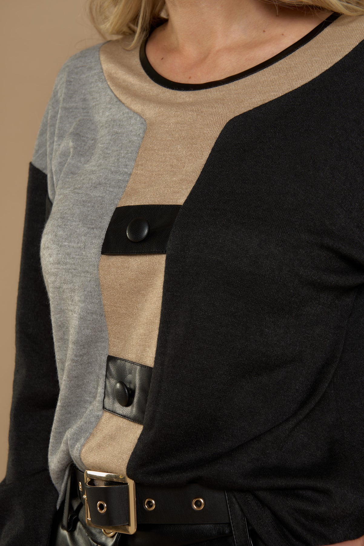 Características: Polera de diseño moderno y sofisticado que combina bloques de color en tonos neutros: negro, gris y beige. Destaca por sus detalles contrastantes con aplicaciones tipo botón en el frente, que aportan un toque distintivo y elegante. Confeccionada en un tejido suave y cómodo, es ideal para looks urbanos o de oficina.