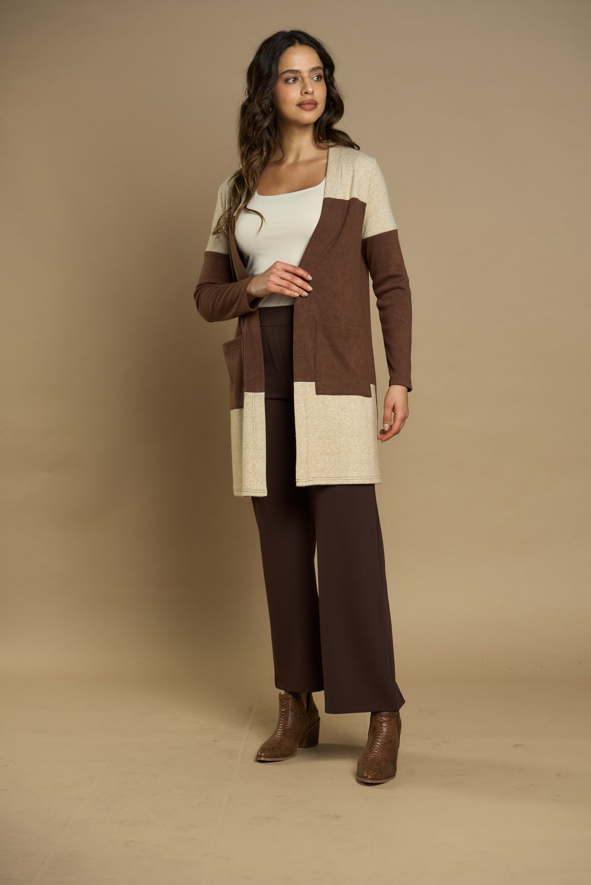 Características: Tapado largo de diseño bicolor en tonos camel y beige, con caída suave y estilo abierto que aporta elegancia y versatilidad.